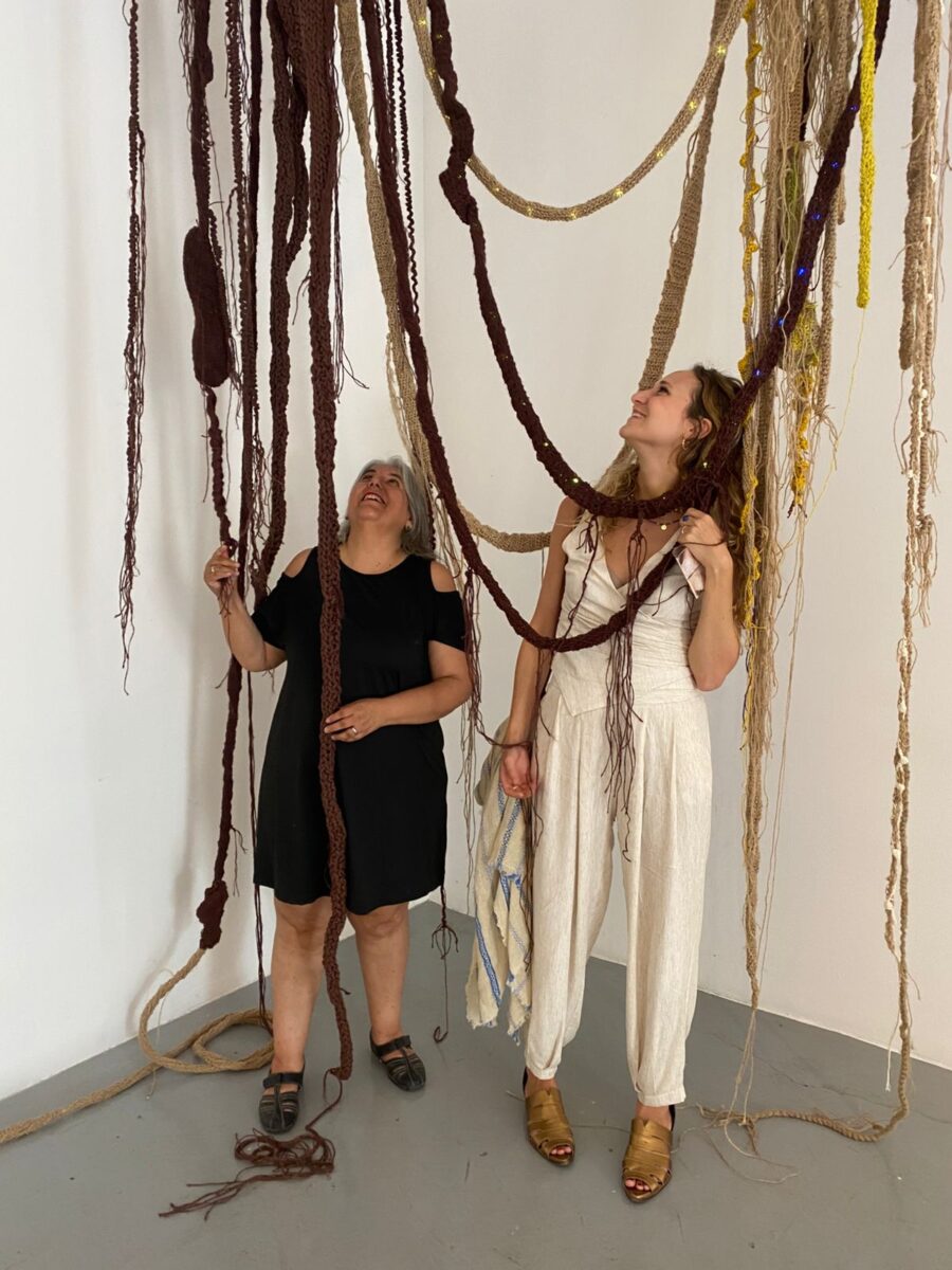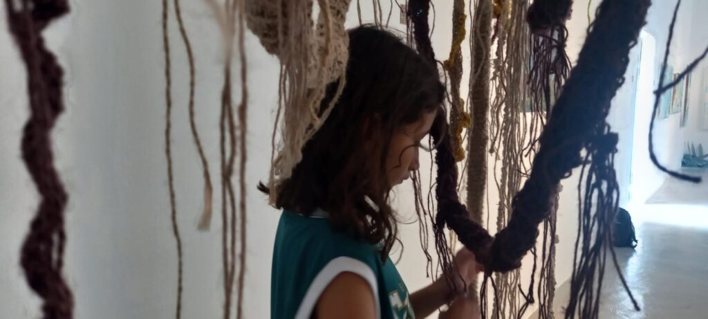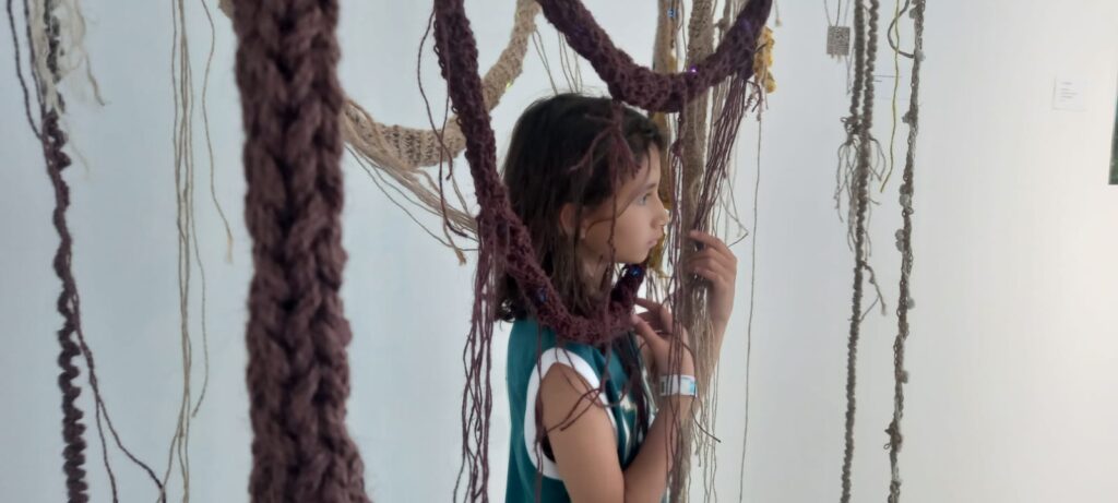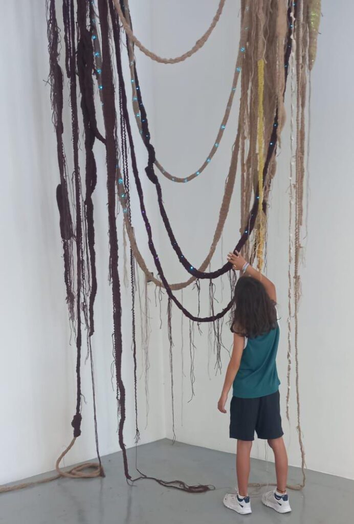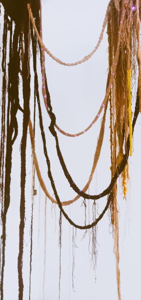 Módulos de raíces de sisal. Representan el entramado de raíces y micorrizas del bosque. Sus sensores táctiles activan sonidos de aves, insectos y agua, revelando la vida oculta bajo el suelo.