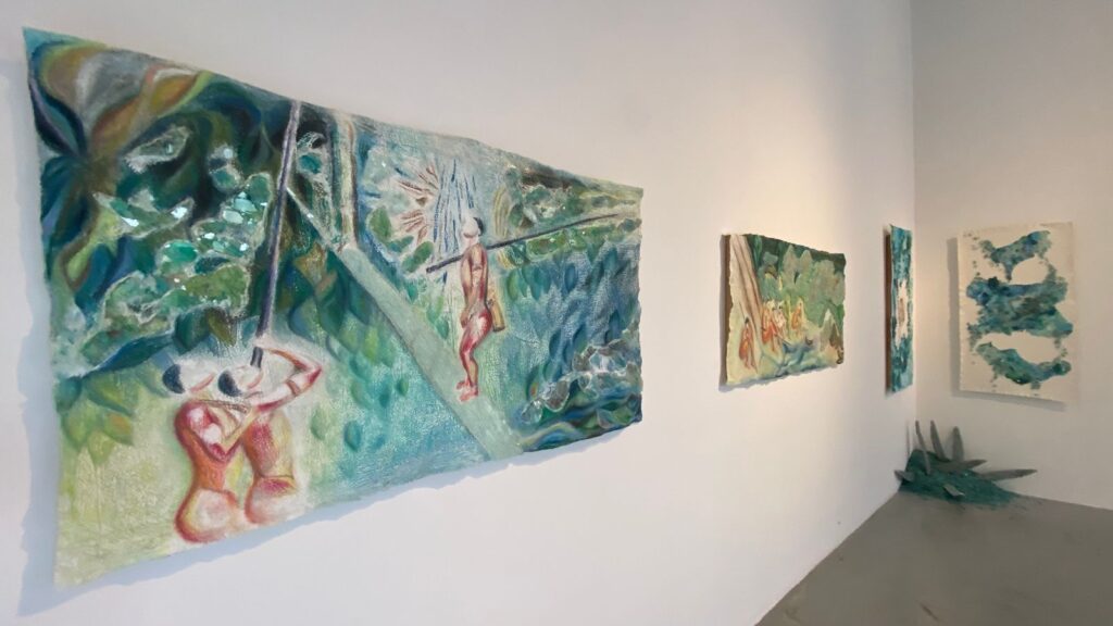 La obra de Marina Bellino refleja poéticamente la crisis ecológica en la Amazonia. A través de pinturas con mosaicos de vidrio, denuncia la destrucción de la selva y valora la resistencia y la cultura indígena. Los fragmentos de vidrio simbolizan tanto la fragilidad de la naturaleza como la posibilidad de reconstrucción y transformación.