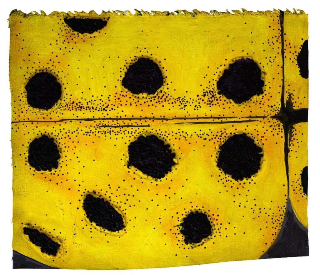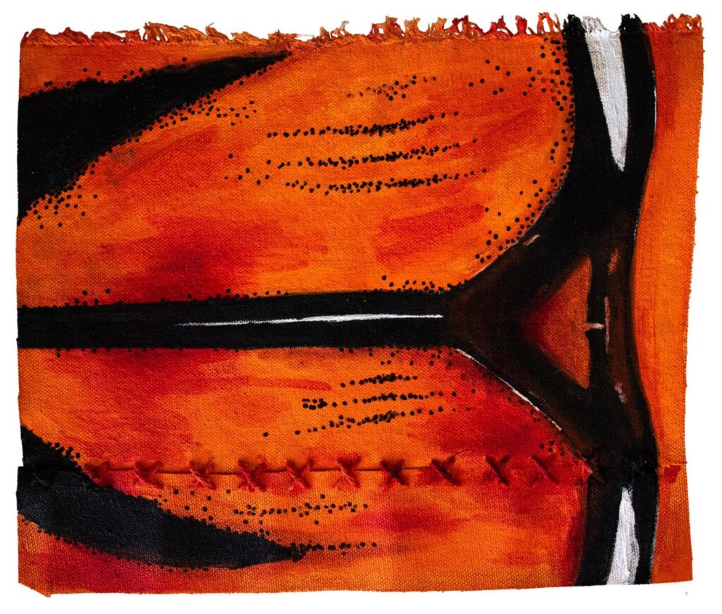 Utilizo tela reciclada, incluso remendada, zurcida, poetizando la humildad. La imperiosa necesidad de restauración. Citar el daño de mi soporte es citar el daño de las especies en progresiva extinción. Las narrativas de la salud planetaria a través de la seducción visual como antibiótico a fortalecer el entendimiento de nuestra relación. Vitalmente, la especie humana y animal sostienen su existencia en ellos.