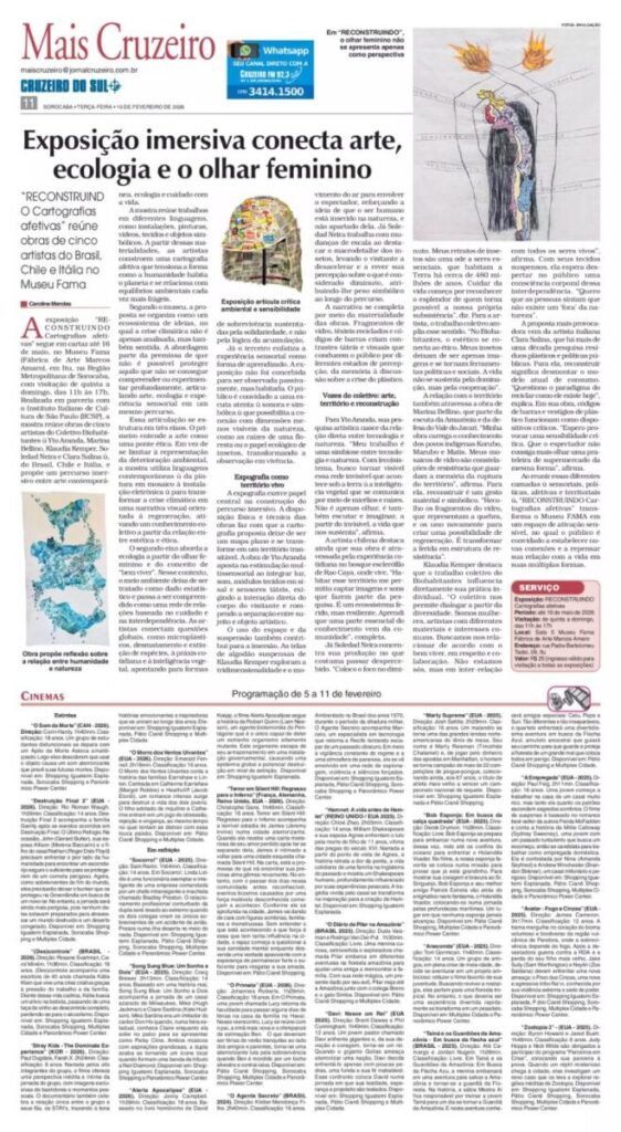 En palabras de Rubens Takamime, “la muestra RECONSTRUINDO – Cartografias afetivas reúne obras de cinco artistas que cultivan conocimientos y prácticas ecológicas del buen vivir o del “vivir en equilibrio”. Con trayectorias interdisciplinarias, las artistas lanzan miradas sensibles y críticas a las condiciones de vida actuales. Ante las catástrofes medioambientales aceleradas por la acción humana, ¿cómo vislumbrar otras formas de existencia más allá de la lógica de la acumulación? En busca de respuestas, el verbo “reconstruir” designa una cartografía de imágenes, sonidos, gestos y pequeñas acciones que nos mueven hacia proyectos de futuro más solidarios y habitables.